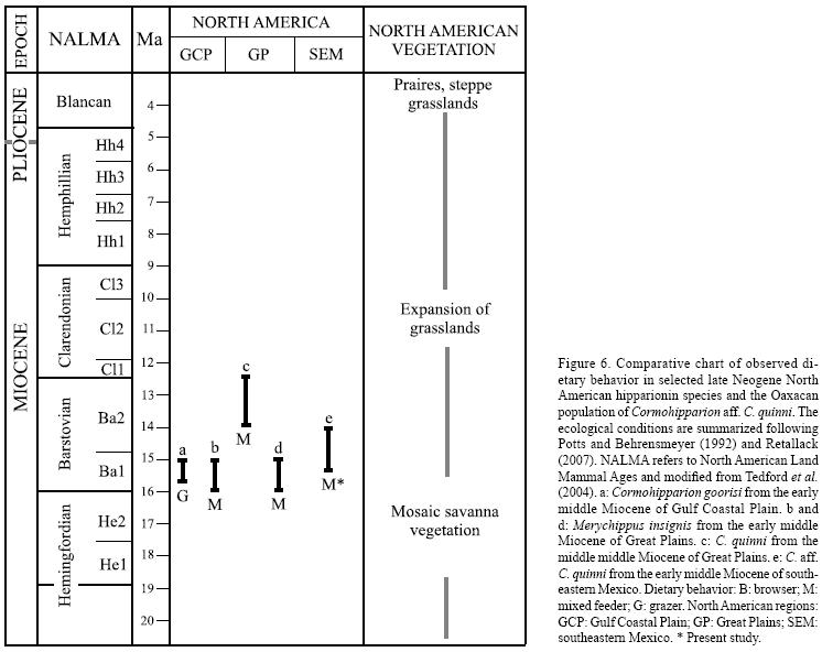 A mixed feeding strategy is related to ecological scenarios with a broad spectrum of possible food resources. It is hypothesized that by the middle middle Miocene (late early Barstovian to late Barstovian) were areas of temperate North America (Great Plains) and tropical North America (southeastern Mexico) with variable vegetation in the habitat mosaic and the concomitant availability of diverse food resources. Such requirements could best be met in ecosystems where variable amounts of grasses, trees and/or bush cover are resources for different kind of herbivores, as occurs in presentday savannas (Potts and Behrensmeyer, 1992). This explanation agrees with the available information about the ungulate communities, palaeobotanical evidence, and geochemical studies from several fossil localities in temperate North America. It indicates that savannalike habitats with an important grass component were common in North America during the middle Miocene (~1812 Ma) (see Janis et al., 2004; Strömberg, 2002, 2004; Retallack, 2007). The known Barstovian Oaxacan large herbivore communities (cf. JiménezHidalgo et al. 2002; FerrusquíaVillafranca, 2003; Tedford et al., 2004), the complex geologic makeup and physiographic features of southeastern Mexico during the middle Miocene (MoránZenteno, 1984; Sedlock et al., 1993; MartínezSerrano et al., 2008), fit confidently into a scenario for the developing of savannalike habitats also in tropical North America (FerrusquíaVillafranca, 2003).