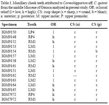 The occlusal pattern and horse size of the Oaxacan hipparionin are closest to those of North American Cormohipparion quinni from the late Barstovian of Nebraska and Colorado, Great Plains (Woodburne, 1996). Both species are similar in having a medium size, crown height of about 45 mm and hipsodonty index of 1.9 (hypsodonty index is defined here as ratio of maximum crown height to maximum crown length of first upper molar), elongate oval protocone, secondary plications on the anterior border of the prefossette, and moderately deep ectoflexid on premolars (see Hulbert, 1988; Woodburne, 1996). A definitive identification at species level, however, is restricted because of the lack of associated cranial diagnostic material. Thus the Oaxacan species is referred as Cormohipparion aff. Cormohipparion quinni. Detailed information on the description and taxonomic identity of this hipparionin species is presented in BravoCuevas and FerrusquíaVillafranca (2008).