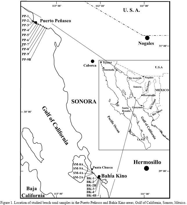 KasperZubillaga and FaustinosMorales (2007) studied the desert and coastal dune sands from San Luis Rio Colorado, El Pinacate, Gulf of Santa Clara and Puerto Peñasco areas and reported that the majority of the sands are fine to medium grained and moderately to well sorted. The study areas receive an average annual rainfall of less than 10 cm and most of the rainfall occurs during the JulySeptember season (Stensrud et al., 1997). Onshore winds from the NW and NE (velocities of 26 m s-1) prevail in the northern part of Gulf of California and occur 20 60% of the time during one month. Southerly onshore winds with velocities of 24 m-1 prevails in the Puerto Peñasco area, occurring 60% of the time during one month (PérezVillegas, 1990). The longshore current that flow adjacent to the study area in the coast region of the Gulf of California mainly generates sediment transport from SE to NW (FernandezEguiarte et al., 1990a, 1990b), whereas semidiurnal tides also redistribute the sediment in the coastal part of this region due to their potential influence on the transport of sands (Thompson, 1968). The Sonoyta and Sonora rivers are continental mainstreams that have contributed the sediments into Gulf of California in Puerto Peñasco and Bahia Kino, respectively.