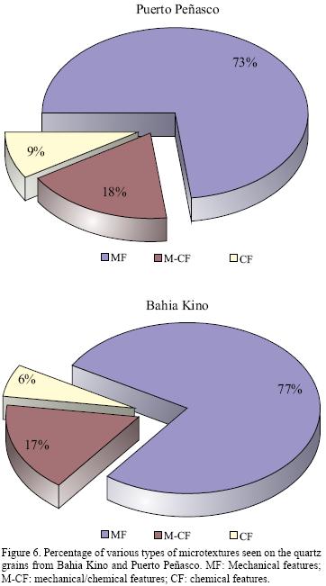 In summary, the microtextural study of quartz grains from the Gulf of California leads to the following inferences: 1) the beach sediments in Puerto Peñasco were dominantly transported to the region by fluvial and aeolian processes, and subsequently deposited in the marine environment; and 2) the Bahia Kino beach sediments were mainly transported by fluvial processes, whereas only a subordinate amount of sediments were derived from aeolian processes, and subsequently deposited in the marine environment.