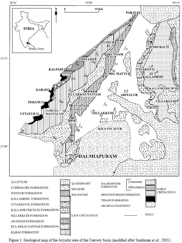 Blanford (1862) first studied and mapped sedimentary rocks in the Ariyalur area and divided them into three distinct groups, i.e., Uttatur, Trichinopoly and Ariyalur. Detailed lithostratigraphic classification of CretaceousTertiary rocks was given by many workers (e.g., Srivastava and Tewari, 1969; Banerji, 1972; Sastry et al., 1972; Sundaram and Rao, 1986; Ramasamy and Banerji, 1991; Sundaram et al., 2001). For the present study, we have followed the lithostratigraphic classification proposed by Sundaram et al. (2001).