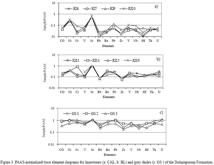 Trace element concentrations of limestones and gray shales were normalized against PAAS values (Taylor and McLennan, 1985) and are plotted in Figure 3. In limestones, the largeion lithophile elements such as Rb and Ba show depletion compared to PAAS (Figures 3a, 3b). When compared to PAAS, CAL (Figure 3a) has low concentration of Sr, whereas BL (Figure 3b) has similar concentration of Sr. The ferromagnesian trace elements (Co, Ni, Cr and V) and the high field strength elements (HFSE: Zr, Y, Nb, Hf, Th and U) are depleted with respect to those of PAAS.