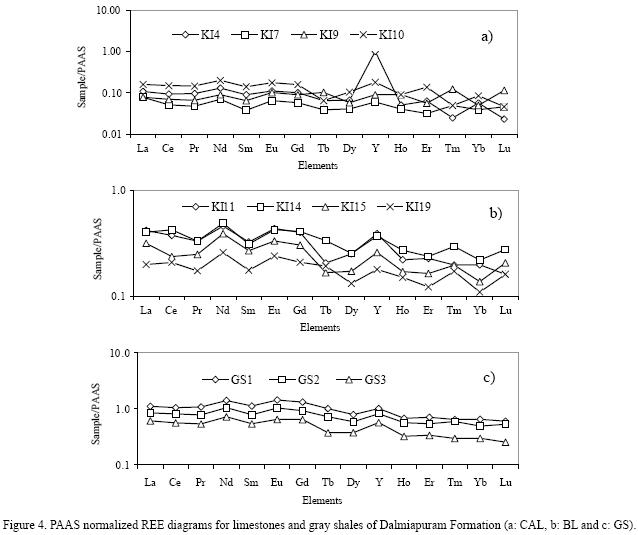 PAASnormalized REE+Y patterns of CAL, BL and GS are shown in Figure 4. CAL shows more or less flat REE+Y pattern with positive La and slightly negative Ce anomalies (Ce/Ce*: 0.83 to 0.97; Table 4) and chondritic Y/Ho ratios (16.11 to 32.20, average 25.8, Table 4; Y/Ho chondrite ratio: ~ 28). BL samples exhibit LREEenriched but HREEdepleted patterns with positive Ce anomalies (Ce/Ce*: 1.03 to 1.17) and chondritic Y/Ho ratios (18.80 to 28.64, average 23.6). One sample from BL (KI15) shows a negative Ce anomaly (Ce/Ce*: 0.86). Like BL, GS also shows flat LREE and depleted HREE pattern. La, Gd and Ce anomalies are completely absent in GS. The limestones (CAL and BL) and gray shales of the Dalmiapuram Formation show positive Eu anomalies (Table 4).