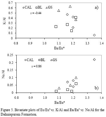 The limestones (CAL and BL) and gray shales from the Dalmiapuram Formation show small variations in Eu anomalies (Eu/Eu*: 1.23 ± 0.1, n=4, 1.16 ± 0.1, n=4 and 1.17 ± 0.1, n=3, respectively; Table 4). The limestones and gray shales show typical positive Eu anomalies. PASSnormalized positive Eu anomalies are found in sediments affected by hydrothermal solutions (Michard et al., 1983; German et al., 1993; Kurian et al., 2008), intense diagenesis (Murray et al., 1991b; MacRae et al., 1992), variations in plagioclase content (Nath et al., 1992) or as result of eolian input (Elderfield, 1988). Hydrothermal activity generally occur in the deepsea regions, but the samples from the Dalmiapuram Formation were deposited under shallow marine environments. So far, no eolian materials were reported from the limestones of Dalmiapuram Formation. MacRae et al. (1992) mentioned that the sediments can attain positive Eu anomalies due to diagenesis. The extent of diagenetic alterations in limestones can be assessed by using immobile trace elements. CAL and BL samples exhibit a positive correlation between Eu and immobile trace (Zr, Y and Th) elements (statistically significant at a significance level of 0.001; linear correlation coefficient r= 0.74, r= 0.99 and r= 0.96, respectively, n=8) supporting the nondiagenetic origin of Eu.