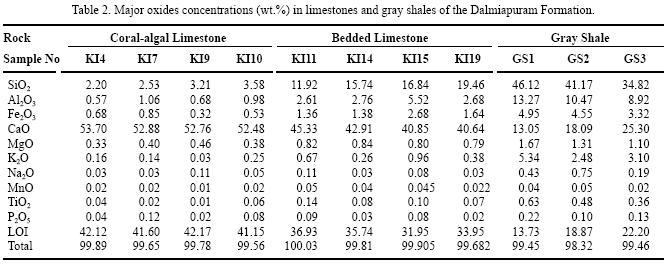 The concentrations of major oxides in the limestones and gray shales of the Dalmiapuram Formation are given in Table 2. Low concentration of SiO2 is observed in CAL (2.20 to 3.58%), whereas high concentrations are found in BL (11.92 to 19.46%). Small variation is found in CaO contents in CAL (52.48 to 53.70%) and BL (40.64 to 45.33%). A higher concentration of Al2O3 is observed in BL (2.61 to 5.52%) than in CAL (0.57 to 1.06%). The Fe2O3 content in CAL and BL varies from 0.32 to 0.85% and from 1.36 to 2.68%, respectively. The contents of K2O and Na2O are low in both CAL and BL (Table 2). A high concentration of SiO2 is observed in GS, which varies from 34.82 to 46.12%, whereas their CaO content is lower (13.05 to 25.30%). Maximum concentrations of Al2O3, Fe2O3, K2O and Na2O are also found in the GS (Table 2).