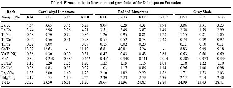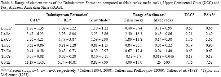 The La/Sc, La/Co, Th/Sc, Th/Co, and Th/Cr ratios show significant variations in felsic and mafic rocks and are most useful in understanding the provenance composition (Wronkiewicz and Condie, 1990; Cox et al., 1995; Cullers, 1995). La/Sc, La/Co, Th/Co, Th/Cr, Cr/Th, and Th/Sc ratios of limestones and gray shales of the Dalmiapuram Formation are compared with felsic and mafic rocks (fine fraction) as well as to upper continental crust (UCC) and PAAS values (Table 6), which suggest that these ratios are within the range of intermediate to felsic rocks. The REE patterns in the sedimentary rocks provide useful information regarding the source rock characteristics (Taylor and McLennan, 1985; McLennan, 1989). In the present study, PAASnormalized values exhibit flat patterns and slight LREE enrichment, which suggest that the terrigenous materials present in the limestones and gray shales were mainly derived from the intermediate to felsic source rocks.