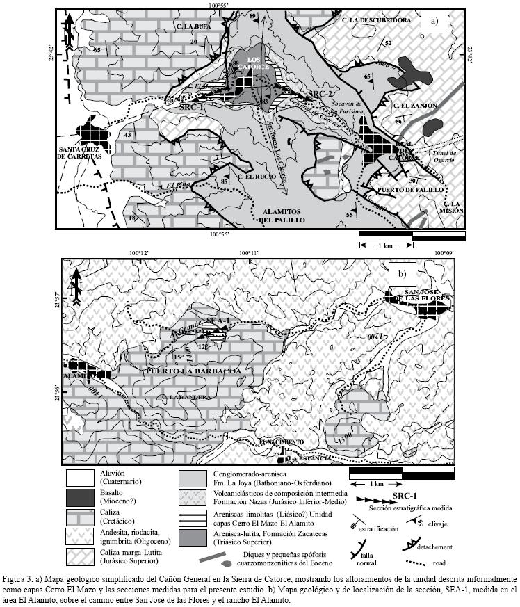 La Formación Nazas está constituida por rocas piroclásticas y flujos de lava de composición intermedia a félsica, e incluye en menor proporción rocas máficas y diques de composición andesíticobasáltica a dacítica. En algunas localidades de la Sierra de Catorce, depósitos de la parte inferior de la sucesión volcánica se encuentran interestratificados con capas de arenisca y litarenita conglomeráticas típicas de facies de canal en un ambiente fluvial a deltaico y con limolitas a lutitas con concreciones de carbonatos, glauconita y ocasionalmente con una estratificación ondulosa de tipo flaser. BarbozaGudiño et al. (2004) propusieron para dicha unidad el nombre informal de capas Cerro El Mazo, cuya edad quedaría comprendida entre el Triásico MedioSuperior, que es la edad de la Formación Zacatecas que la subyace y 172 Ma (Bajociano), que es la edad (UPb, circón) de un dique riolítico que corta a toda la sucesión volcánica (BarbozaGudiño et al., 2004). Con base en estas relaciones estratigráficas, dichos autores sugirieron una correlación cronoestratigráfica de las capas Cerro El Mazo con la Formación Huayacocotla de los Estados de Hidalgo, Puebla y Veracruz.