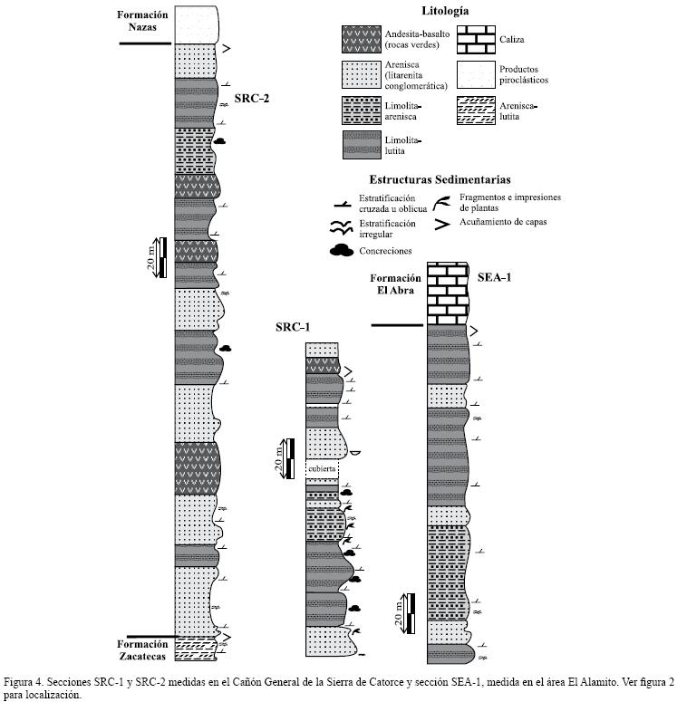La secuencia SRC2 (Figura 4), descansa discordantemente sobre las turbiditas de la Formación Zacatecas y consiste de 280 m de litarenitas, limolitas, lutitas y cuerpos concordantes de rocas verdes. En la mitad inferior de la secuencia es notable el predominio de los bancos gruesos de hasta tres metros de espesor de las areniscas a litarenitas conglomeráticas, mientras que en la mitad superior predominan las limolitas a lutitas con concreciones de forma lenticular de carbonato de calcio. Un cuerpo de rocas verdes se encuentra en la parte inferior de la secuencia y alcanza hasta 26 m de espesor, y dos cuerpos más, de hasta 15 m de espesor cada uno, se intercalan en las limolitas de la parte superior de la secuencia. Estos cuerpos concordantes representan flujos de lavas de composición máfica, de grano fino, con textura traquítica amigdaloide, así como sus posibles conductos subvolcánicos, que se observan intrusionando a la Formación Zacatecas. Sobreyaciendo a la secuencia medida, aparece una unidad volcánica de color claro, muy deformada, con aspecto de filita o metariolita y estructura brechada en algunos horizontes y laminada en las partes con grano más fino. Esta unidad fue considerada ya como un flujo piroclástico perteneciente a la Formación Nazas, tomando como criterio para separar esta formación de las capas Cerro El Mazo, el predominio del material volcánico en la Formación Nazas y el carácter eminentemente subaéreo del mismo.