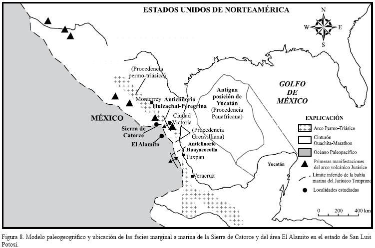 Considerando que la correlación entre las secciones estudiadas puede ser sólo parcial, dadas las diferentes faunas reportadas, así como las edades máximas de los depósitos establecidas por la geocronología de los circones detríticos, se propone un modelo paleogeográfico (Figura 8) que habrá de considerarse con reserva en el detalle, no obstante que de manera más general sí está sustentado en el hecho de que la fauna reportada en ambas secuencias, tanto en el Cañón General de la Sierra de Catorce, como en El Alamito, permite establecer una correlación por lo menos parcial con la Formación Huayacocotla, principalmente a través de la fauna de amonites reportados por Erben (1956) para la Sierra de Catorce, como Vermiceras sp. y Arnioceras cf. Abjectum Fucini n. subsp., cabiendo aclarar también que la formación Huayacocotla descrita en los estados de Veracruz, Hidalgo y Puebla, correspondería según sus facies a un ambiente marino poco más profundo que el reportado para la Sierra de Catorce y aún que el de El Alamito.