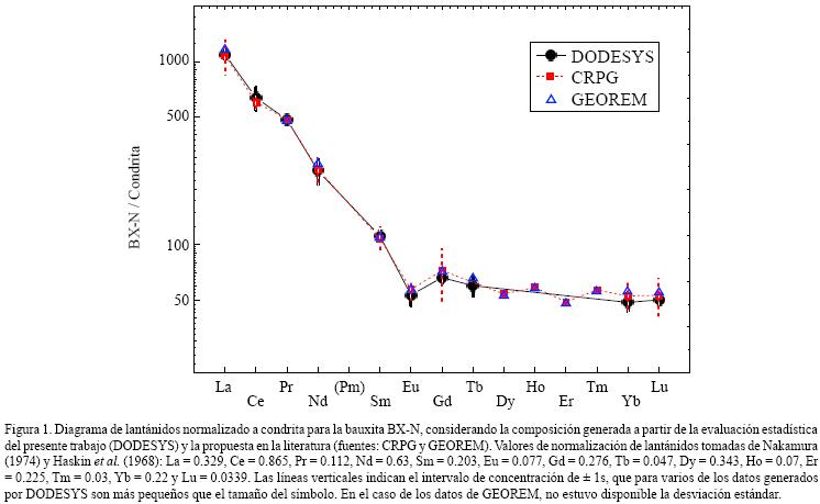 La validez de la composición calculada por DODESYS para cada MRG fue evaluada considerando los siguientes puntos: (a) la suma de los elementos mayores (ΣEM = SiO2 + TiO2 + Al2O3 + Fe2O3 + FeO + MnO + MgO + CaO + Na2O + K2O + P2O5 + CO2 + H2O+ + H2O) debería resultar en un valor de 100.0 ± 1.0%, como se ha observado en el caso de la composición de bauxita BXN (ΣEM = 100.844%; Tabla 2). Esta condición se cumple en la composición propuesta por el CRPG (ΣEM = 100.03%; Tabla 1), pero no por la propuesta por GEOREM (Tabla 1; ΣEM = 101.3; <http://georem.mpchmainz.gwdg.de/sample_query.asp>); (b) la composición de lantánidos debería generar un patrón normalizado a condrita geoquímicamente consistente. Los valores de normalización (en ppm) utilizados para la preparación de los diagramas de MasudaCoryell fueron tomados de Haskin et al. (1968) y Nakamura (1974): La = 0.329, Ce = 0.865, Pr = 0.112, Nd = 0.630, Sm = 0.203, Eu = 0.077, Gd = 0.276, Tb = 0.047, Dy = 0.343, Ho = 0.070, Er = 0.225, Tm = 0.030, Yb = 0.220, Lu = 0.0339. Esta selección de valores obedece a las recomendaciones hechas por Rock (1987). El patrón de lantánidos de la bauxita BXN (Figura 1) se caracteriza por un gran enriquecimiento en elementos ligeros (LaBXN ~1000×LaCondrita), una pequeña anomalía en Eu y un patrón plano para los elementos pesados. Este patrón de lantánidos, elaborado con los datos generados por DODESYS (Tabla 2), es comparable con los diagramas construidos a partir de las composiciones sugeridas por CRPG y GEOREM (Tabla 1). Sin embargo, es evidente que la incertidumbre asociada a la concentración es mucho menor para los datos generados por DODESYS, que aquellos propuestos por el CRPG. Los diagramas de MasudaCoryell para el resto de los MRG se encuentran disponibles en formato electrónico (Figuras A1, A3, A5, A7, A9, A11 y A13).