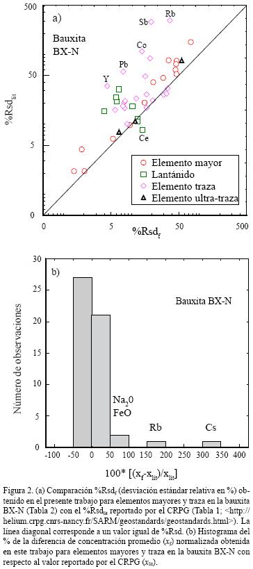 Es importante señalar que la composición recomendada para los MRG bajo estudio continúa siendo la misma que se propuso a partir de las evaluaciones realizadas en la década de 1980, como se puede constatar en la página web del CRPG (<http://helium.crpg.cnrsnancy.fr/SARM/geostandards/geostandards.html>) o en la Tabla 1, en donde se presenta la composición propuesta por el CRPG y la base de datos GEOREM para la bauxita BXN. Por otra parte, en la literatura (Kane, 2001) se ha señalado que la utilidad de los MRG se incrementa en la medida que la incertidumbre en los valores de referencia es más pequeña en comparación a la observada en los datos analíticos de rutina. En este contexto se ha recomendado que la primera debería tener magnitudes de, al menos, una tercera parte de la segunda (Uriano y Gravatt, 1977). Es por ello que se esperaría disminuir la incertidumbre en los valores de referencia al considerar un mayor número de datos a los disponibles en las bases de datos más recientes para estos MRG, principalmente porque la mayoría de ellos han sido generados con métodos instrumentales más modernos.