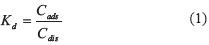donde Kd es el coeficiente de adsorción de atrazina; Cads es la concentración de atrazina adsorbida; y Cdis es la concentración de atrazina disuelta.