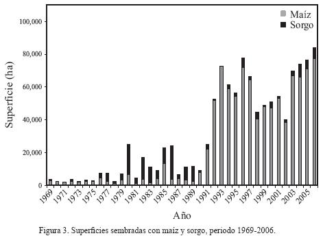 El análisis de información referente al DR 063 indica que atrazina ha sido uno de los herbicidas más utilizados, con dosis de aplicación de aproximadamente 0.9 kg ha1 (VilladaCanela, 2006). Sin embargo, no se tiene información completa sobre el historial de aplicación del herbicida y de las zonas donde se ha aplicado. Una referencia respecto a la aplicación histórica de atrazina en el distrito son las superficies sembradas con los cultivos de maíz y sorgo, donde se podría aplicar el herbicida, y que presentaron un incremento del 2,385% en el periodo de 1969 al 2006. En la Figura 3 se presenta el historial de las superficies sembradas con estos cultivos (CNA, 1999b, 2000b, 2001b, 2002b). Durante el ciclo otoñoinvierno 19981999 se estimó que en todo el distrito se consumió un total de 13.5 toneladas de atrazina (SEMARNAPIMTA, 2000). Para el ciclo primaveraverano 2004, la aplicación de atrazina en el DR 063 se había reducido a 250 kg (VilladaCanela, 2006) mientras que para el 2007 no se tienen registros del uso este herbicida (HernándezAntonio, 2008).