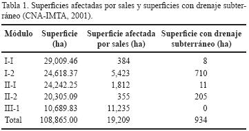 En el distrito se presentan problemas de salinidad debido a las altas tasas de evaporación, los niveles freáticos someros, el uso de aguas salinas para el riego y a la brisa salina (CNA, 2002c). En el año de 1991 se reportaba que 8,680 ha estaban afectada por sales y para el año 2001 la superficie afectada aumentó a 19,209 ha (17.6% de la superficie agrícola), de las cuales sólo 934 ha contaban con drenaje subterráneo (CNAIMTA, 2001). En la Tabla 1 se presenta la cantidad de superficie afectada por sales y la superficie que cuenta con drenaje subterráneo en el DR 063 (CNAIMTA, 2001).