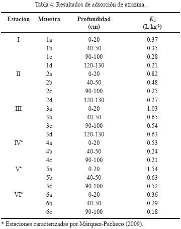 En la Tabla 4 se presentan los coeficientes de adsorción de atrazina en las muestras de suelo. Los resultados muestran coeficientes de adsorción de atrazina en el rango de 0.18 a 1.54 L kg1, con promedio de 0.49 L kg1. Los coeficientes de adsorción obtenidos están en el intervalo de los valores reportados en la literatura para adsorción de atrazina en suelos agrícolas (SocíasViciana et al., 1999; Coquet, 2003; Drori et al., 2005). Se observa una tendencia a disminuir la adsorción de atrazina respecto a la profundidad en los perfiles de suelo.