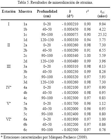 Los resultados de la mineralización de atrazina en las muestras de suelo del DR 063 se presentan en la Figura 6. Se observan cinéticas muy lentas, mineralizándose entre 1.4 y 31.1% del herbicida en más de cinco meses de experimentación. A diferencia de lo publicado anteriormente (Kruger et al., 1993; Accinelli et al., 2001; Hang et al., 2003; Blume et al., 2004), en este trabajo no se observó relación directa entre la profundidad y la mineralización de atrazina (Figura 6). Sin embargo, en la mayoría de los perfiles de suelo estudiados se presentaron cinéticas de mineralización más rápidas en las muestras con menor adsorción de atrazina, es decir a profundidades de 100 cm o mayores. Esto obedece a que los compuestos disueltos están disponibles para los microorganismos, mientras que los compuestos adsorbidos no lo están (Barbash y Resek, 1997). Se calcularon los coeficientes de la cinética de mineralización de atrazina así como las vidas medias, considerando cinéticas de primer orden (Tabla 5). De acuerdo con Beulke y Brown (2001), la cinética de primer orden es aceptable, cuando el valor de r es mayor que 0.87; aquí los valores de r fueron superiores a 0.9. Los resultados muestran vidas medias de atrazina entre 0.76 y 25.32 años, la vida media promedio es de 4.93 años. Las vidas medias de atrazina en los suelos estudiados son altas, comparadas con resultados publicados en la literatura (Kruger et al., 1993; Accinelli et al., 2001), y son similares a las reportadas en suelos sin historial de aplicación del herbicida (Hang et al., 2003; Blume et al., 2004), por lo que la lenta mineralización de atrazina puede relacionarse a que los microorganismos de los suelos están poco adaptados al herbicida, ya sea por no haber aplicación reciente del herbicida.