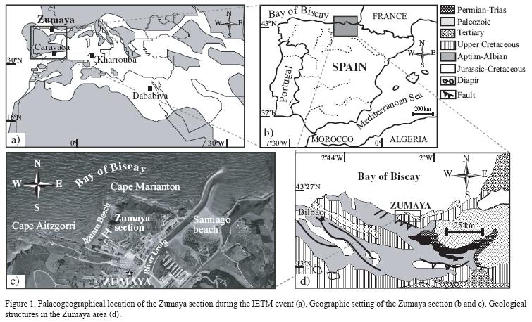The Zumaya section is located in northern Spain (43°18'00.35"N and 2°15'35.17"W), near the locality of Zumaya (Guipúzcoa province, Basque Country, western Pyrenees), on the Itzurun beach (Punta Mariantón). The access to the Zumaya section is easy by San Telmo beach (Figure 1). The Zumaya section contains one of the most complete and expanded deepwater successions across the PaleoceneEocene transition (Molina et al., 1999). For this reason, multidisciplinary studies have been carried out across the PaleoceneEocene transition in this section, including magnetostratigraphic, isotopic, cyclostratigraphic and micropalaeontological analyses (Canudo et al., 1995; Ortiz, 1995; Arenillas and Molina, 1996; OrueEtxebarria et al., 1996; Kuhnt and Kaminski, 1997; Schmitz et al., 1997; Arenillas and Molina, 2000; Alegret et al., 2009a).