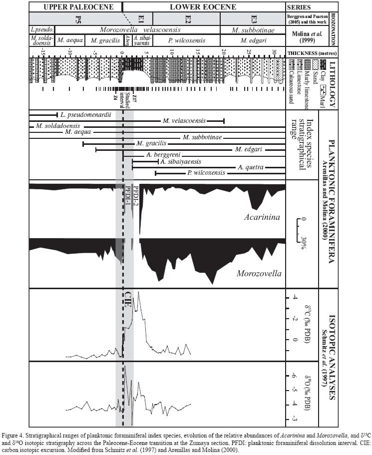 The study of the quantitative stratigraphical distribution of species and genera by Arenillas and Molina (2000) showed relevant events across the P/E boundary at the Zumaya section. Their quantitative analyses indicated a major increase in low latitude acarininids coinciding with the CIE interval, similar to that recognized by Canudo and Molina (1992a) and Canudo et al. (1995). As illustrated in Figure 4, the Acarinina increase and the Morozovella decrease coincide with the δ13C and δ18O shifts across the P/E boundary at the Zumaya section (Figures 4 and 5), according to data by Schmitz et al. (1997) and Arenillas and Molina (2000).