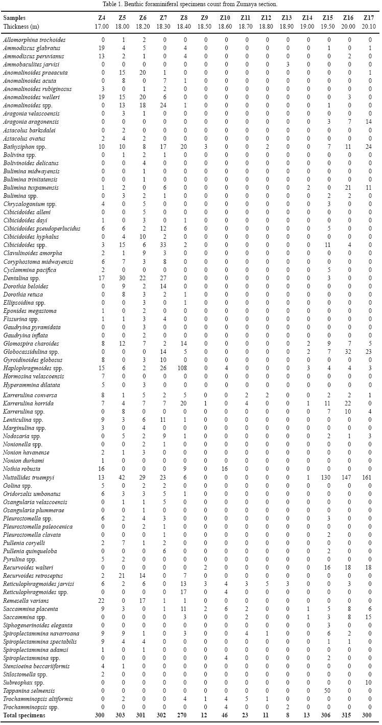 All counted species (Table 1) were mounted on microslides for a permanent record and deposited in the Invertebrate Paleontology, Paleoecology and Biostratigraphy LaboratoryResearch Unit (DPS): 02/UR/1002 at the Faculty of Sciences of Tunis. Most of the identified species were photographed under a reflected light microscope. The planktonic foraminiferal quantitative information is based on data by Arenillas and Molina (2000). The environmental deposition at the Zumaya section may be deduced from the range and tolerance depth of species composing different benthic foraminiferal assemblages (Figure 2). Based on benthic foraminiferal data, we attempted to infer the palaeobathymetry, faunal turnover and pattern of extinction. The identification of benthic foraminiferal species is mainly based on Ellis and Messina (Catalogue of Micropalaeontology, 1940 to present), Tjalsma and Lohmann (1983), Van Morkhoven et al. (1986), Alegret and Thomas (2001), Kaminski and Gradstein (2005), Ortiz (2006), and Alegret and Ortiz (2006).