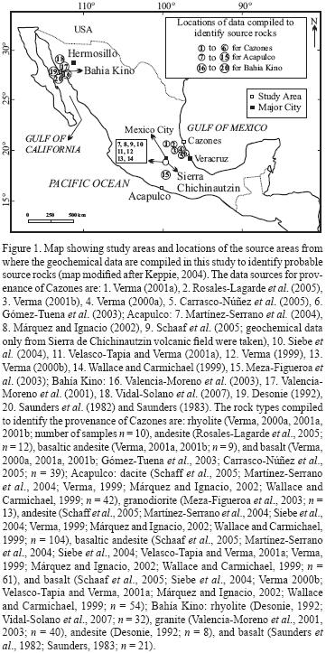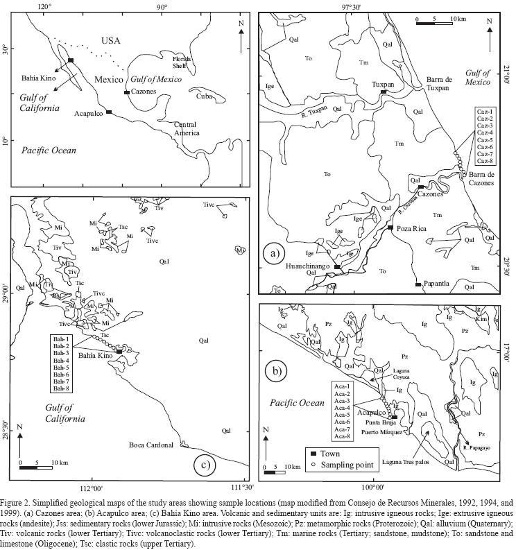 The purpose of this study is to evaluate the geochemical discriminations among the three beach areas and to investigate their source rocks. To identify the probable source rocks, the geochemical data of these sands are compared with dacite, rhyolite, granite, granodiorite, andesite, basaltic andesite, and basalts from areas located relatively close to the study areas (see Figure 1 for locations, rock types, and sources). The comparison was made individually for the three study areas (Cazones, Acapulco, and Bahía Kino), because they are supposed to receive sediments from totally different sources (ArmstrongAltrin and Verma, 2005; RosalesHoz and CarranzaEdwards, 1995; Marsaglia, 1991). In addition, the role played by accessory heavy minerals on the control of trace and rare earth elements (REE) will be also addressed in this paper.