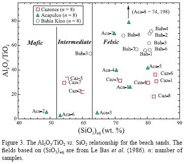 The variation in Al2O3/ TiO2 ratio is larger for Acapulco sands (~3198; Table 4; Figure 3) than for Bahía Kino (~5372), and Cazones sands (~1836). Similarly, Al2O3 contents in Acapulco sands range from ~8% to 16%; for comparison, in Bahía Kino sands they vary from ~8% to 11% and in Cazones sands from ~5% to 9%. The TiO2 concentration is also higher in the three Acapulco sands (Aca2, Aca3, and Aca6; Table 4) than all other sand samples, at 99% confidence level as determined from f and t tests (Verma, 2005).