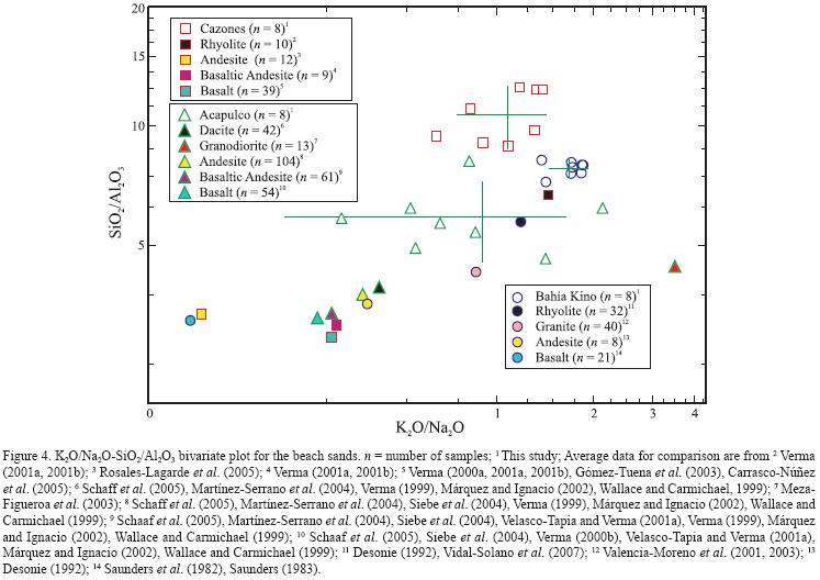 Figure 4 shows the K2O/Na2OSiO2/Al2O3 relationship for all sands as well as probable source rocks. The average geochemical data used in this plot for comparison are from the source areas located relatively close to the study areas (see Figure 1 for more details). The mean values of SiO2/Al2O3 for felsic sands of all three areas (Cazones, Acapulco and Bahía Kino) are slightly higher as compared to their respective source rocks (Figure 4).