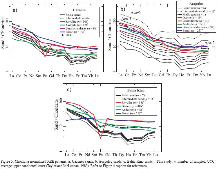 In order to identify the provenance, the REE data of the source rocks, located relatively close to the study areas are compared to the present study (refer Figure 1, for locations and other details). The chondritenormalized REE patterns for Cazones, Acapulco, and Bahía Kino sands together with the source rocks are given in the Figure 5a, b, and c, respectively.