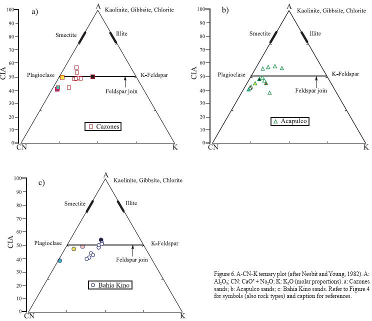 The CIA values of all sand samples are plotted in Al2O3(CaO* + Na2O)K2O (ACNK) compositional space (molecular proportions) in Figure 6a, b, c, for Cazones, Acapulco, and Bahía Kino sands, respectively. The degree of weathering is quite variable for Cazones and Acapulco sands, which are scattered near the feldspar join line (Figure 6a, b). This scatter reveals steady state weathering conditions, which occur where climate and tectonism vary greatly, altering the rates of chemical weathering and erosion, and resulting in the production of chemically diverse sediments (Nesbitt et al., 1997; Selvaraj and Chen, 2006). The Bahía Kino sands plot parallel to the ACN line (Figure 6c) and define a nonsteady state weathering trend towards the "A" join. This nonsteady state weathering indicates balanced rates of chemical weathering and erosion, which produces compositionally similar sediments over a long period (Nesbitt et al., 1997; Selvaraj and Chen, 2006). For comparison, the average geochemical data are also used in these plots, which are from the source areas located relatively close to the study areas (see Figure 1 for more details). This comparison reveals that the studied sand samples are weakly affected by chemical weathering.