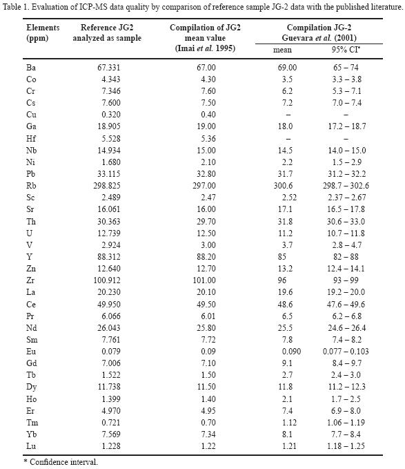 Trace elements, including fourteen rareearth elements (REE), were determined using a Finningan MAT ELEMENT high resolution inductively coupled plasma mass spectrometer (ICPMS) at the National Geophysical Research Institute, India, following the methods of Balaram et al. (1995), Wu et al. (1996), and Yoshida et al. (1996). Precision and accuracy for analysis of reference material JG2, as determined by ICP are compared with data published by Imai et al. (1995), are better than ± 1% for Ba, Co, Cu, Ga, Nb, Pb, Rb, Sc, Sr, Y, Zn, Zr, La, Pr, Nd, Sm, Ho, Er, and Lu. The analytical precision for other elements such as Cr, Cs, Hf, Ni, Th, U, V, Eu, Gd, Tb, Dy, and Yb are better than ± 3%, whereas it is better than ± 5% for Tm (Table 1). Similarly, the values are within the 95% confidence interval given in Guevara et al. (2001), except for the elements Co, Cr, Cs, Ga, Pb, Sr, Y, Zr, La, Ce, Pr, Gd, Tb, Ho, Er, and Tm (Table 1).