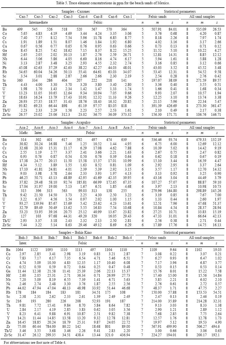 Trace element concentrations are reported in Table 5. The Bahía Kino sands are higher in Ba, Rb, Th, U, Zr, and Hf than Acapulco and Cazones sands. However, other trace elements like Co, Cr, Sc, and V are higher in Acapulco than in Cazones and Bahía Kino sands. Two samples from Cazones (Caz1 and Caz3) and four from Bahía Kino (Bah2, Bah4, Bah5, and Bah7) are higher in Zr and Hf. The differences in trace element contents among the three study areas are probably due to the sorting effect of sands or differences in source rocks.