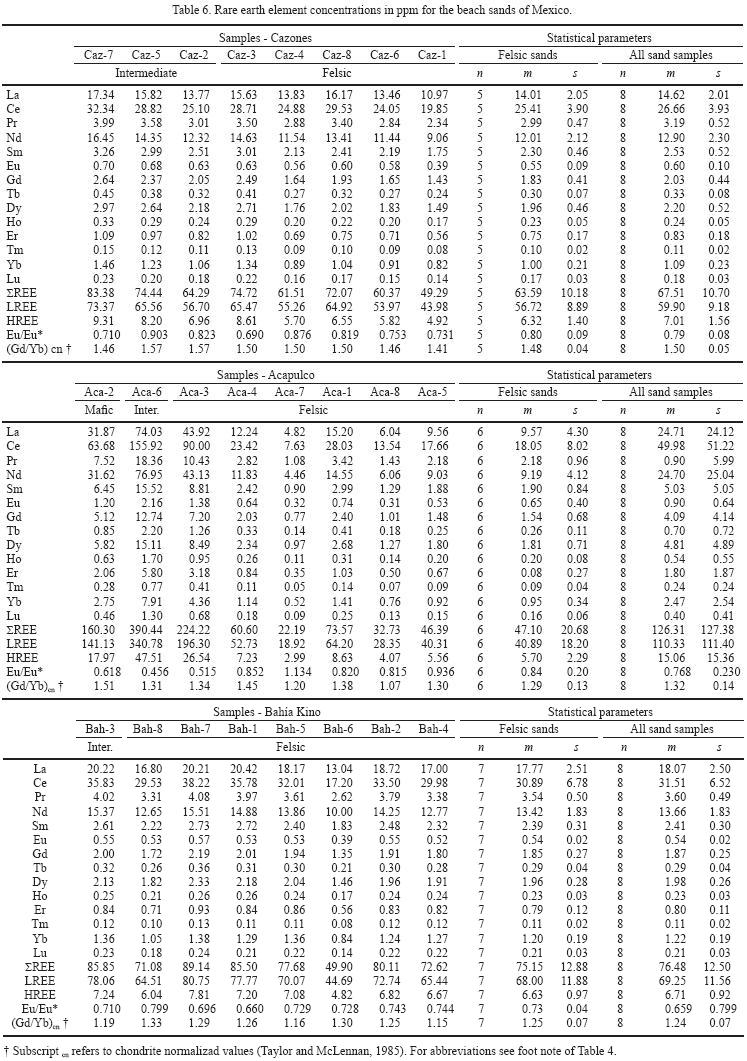 Furthermore, concentration of Tibearing minerals like ilmenite during recycling would lead to an increase in TiO2 abundances in the respective samples (Garcia et al., 1994, 2004; Mongelli et al., 1996; Condie et al., 2001; Campo and Guevara, 2005; Cai et al., 2008; PePiper et al., 2008). In this study, the higher abundances of TiO2, Ta, Nb, and Nd contents, particularly in the three Acapulco sands (Aca2, Aca3, and Aca6; Tables 4 and 5), are consistent with the observed presence of the Tibearing mineral ilmenite (Moore et al., 1992; Das et al., 2006; Bernstein et al., 2008; KasperZubillaga et al., 2008a). Occurrence of ilmenite mineral along the southwestern Mexican Pacific coast was also documented by CarranzaEdwards et al. (2009). For the Acapulco sands, there is a statistically significant positive correlation between TiO2 and ∑REE content (r = 0.9967; n = 8; critical t value for 99% confidence level is 0.834; Verma, 2005). Hence, it is interpreted that the higher ∑REE content in the three samples might be due to ilmenite, which probably is an indicator of the source rocks. Some ilmenite minerals from felsic igneous rocks show relatively high values of the partition coefficients, especially for LREE (TorresAlvarado et al., 2003). However, the presence of negative Eu anomaly in these three samples from Acapulco point to a more complex nature of the processes leading to the REE enrichment.