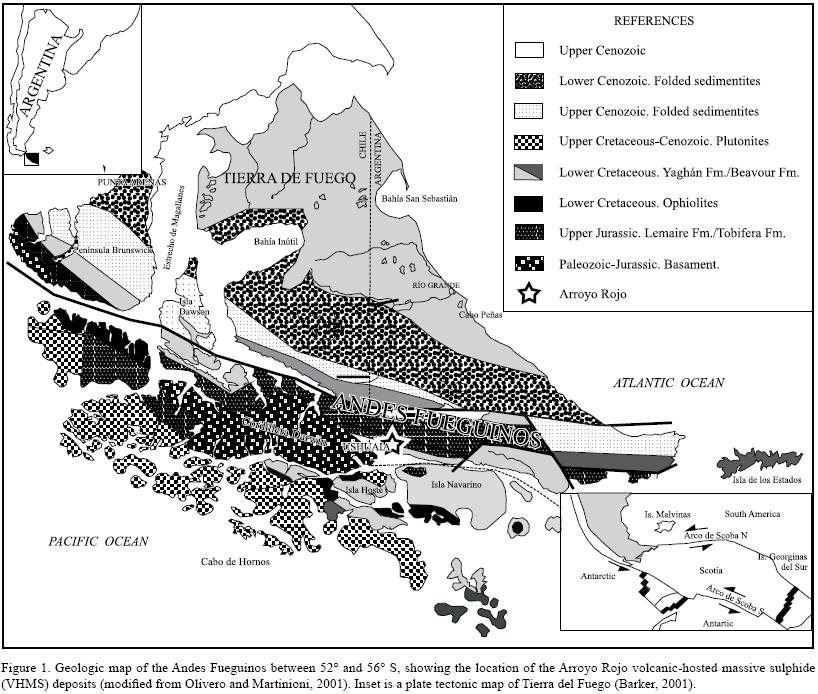 Since Jurassic times, continental arc magmatism in the southern portion of the Andean Cordillera has produced many epithermal deposits (Schalamuk et al., 1997) but few volcanichosted massive sulphide (VMS) deposits. Tierra del Fuego is one of the scarce places in the southern Andes where VMS mineralization may be encountered. The potential of this area to host VMS deposits was shown since the decade of 1970 and early 1980, when base metals exploration was developed by several companies (AguilarSt. Joe 197072, 198082; Noranda 199496; YamanaPolimet 199596; Westmin 199697). These efforts were mostly directed to pursue discovery of volcanichosted polymetallic massive sulphide deposits located in a vast rhyolitic volcanic field forming an outcrop belt (Figure 1) inboard of the Cretaceous backarc basin. The work of the aforementioned companies outlined two regional targets: Sierra de Sorondo in the south, and Sierra de Alvear in the north (Figure 1). The first recognized massive sulphide deposit in the area was the socalled Beatriz mine (Zubia et al., 1989) where a small lens of massive to semimassive polymetallic sulphides, including cobaltite (Ametrano and Paar, 1996) was identified.