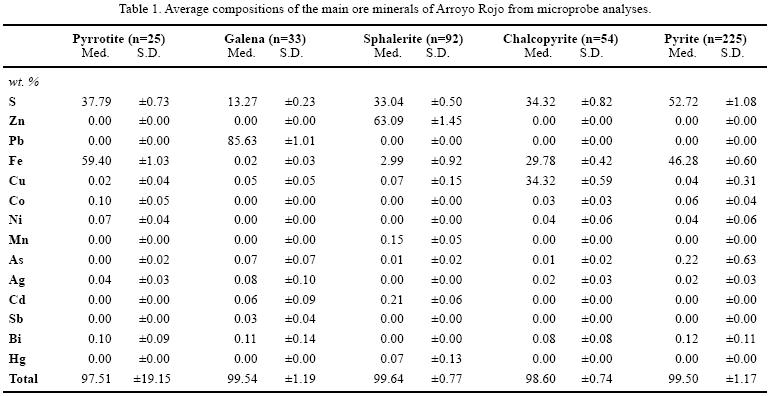 Polished sections of ore samples were examined under both optical and scanning electron microscopes (SEM). Specimens were etched with HNO3 (60%) to develop a better definition of textural types. The composition of minerals (Table 1) was obtained by means of a Cameca SX50 electron microprobe at the University of Barcelona, with a 30 nA and a 15 kV acceleration voltage. Calibration employed both natural and synthetic mineral standards.