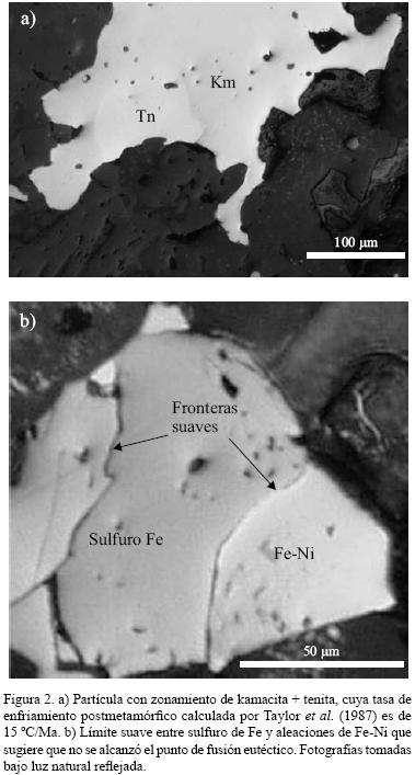Se encontraron algunos granos metálicos con zonamiento de taenita+kamacita (Figura 2a) similares a los utilizados por Taylor et al. (1987), quienes calcularon la tasa de enfriamiento para esta condrita.