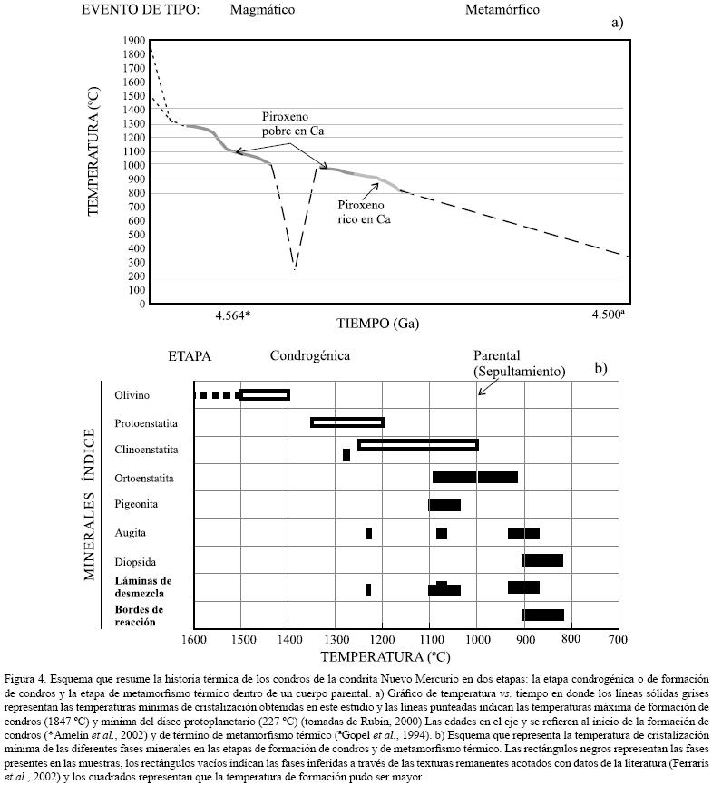 Por otra parte, es importante mencionar que el rango de temperaturas metamórficas propuesto para la condrita Nuevo Mercurio (817933 °C) es muy similar al de las temperaturas obtenidas en condritas ordinarias de tipo 6, las cuales son de 800950 °C (McSween y Patchen, 1989). Dodd (1981) compiló datos de temperaturas de metamorfismo de trabajos diferentes realizados hasta esa fecha, y propuso que el rango de temperaturas metamórficas para condritas ordinarias tipo 5 es de 700750 °C y de 750950 °C para las tipo 6; es decir, que la temperatura habría aumentado con el tipo textural. Sin embargo, Huss et al. (2006) sugieren que hay evidencia de que los tipos 4 y 5 alcanzaron temperaturas similares a las del tipo 6, pero con un enfriamiento más rápido. Las tasas de enfriamiento obtenidas a partir de la metalografía de condritas H5 fluctúan entre 10 y 20 °C/Ma, y para las H6 son de 10 °C/Ma (Reisener y Goldstein, 2003), por lo que la tasa de enfriamiento en la condrita Nuevo Mercurio de 15 °C/Ma, obtenida por Taylor et al. (1987), fue comparativamente rápida, pero consistente con su clasificación H5.