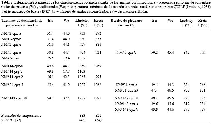 2) Equilibrio metamórfico. El rango de temperaturas calculado para los piroxenos ricos en Ca se encuentra entre 817 y 933 °C, el cual quedó registrado en los bordes de piroxeno rico en Ca y algunas texturas de desmezcla tales como las láminas (En~49Wo~44); lo anterior significa que la evolución de estas texturas se dio dentro de un cuerpo parental relativamente grande.