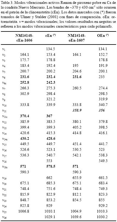 Con el fin de detectar el tipo de polimorfo presente en algunos cristales del condro porfídico NM#148, se obtuvieron espectros Raman del centro y de la orilla de un mismo fenocristal (Figura 1f). Las bandas características del espectro Raman (Tabla 3) para la lectura del centro del cristal corresponde a clinoenstatita (370 y 430 cm1) y para la orilla del mismo fenocristal corresponde a ortoenstatita (358 cm1). Los valores de los minerales en la condrita Nuevo Mercurio son contrastados con valores de Ulmer y Stalder (2001) para su mejor identificación (Tabla 3). Esto indica que el hábito de fenocristal encierra actualmente dos de los polimorfos de la enstatita, en donde predomina al centro el polimorfo monoclínico y a las orillas el polimorfo de inversión que es la ortoenstatita.