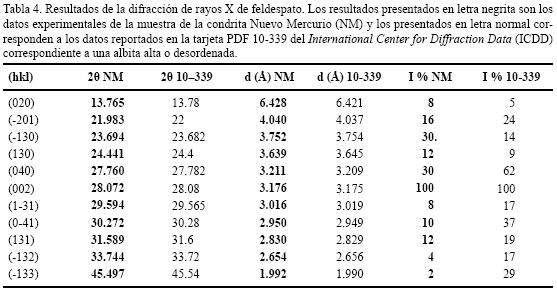 En este trabajo, por medio de la difracción de rayos X de polvo, se reporta la presencia de plagioclasa desordenada de tipo sódico. En la Tabla 4 se observan los valores de 2θ y las distancias interplanares para el feldespato en la condrita Nuevo Mercurio respecto a valores reportados en el documento PDF 10339 del ICDD. También se identificaron los minerales reportados anteriormente por Fredrikson et al. (1979), tales como el olivino, enstatita y kamacita.