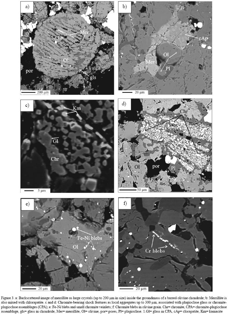 The phosphates in Escalón are mostly merrillite and up to 200 µm in size; merrillite was found in the matrix associated with kamacite, troilite and chromite; it was also found as relatively large crystals in the groundmass of barred olivine chondrule (Figure 3a) and as crystals attached to the surface of chondrules. Merrillite is also mixed with chlorapatite (Figure 3b).