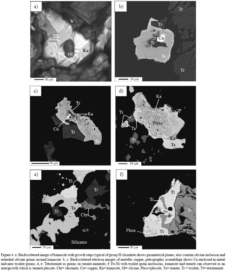Kamacite can be observed on large grains up to 1 mm in diameter, as tiny granules (15 μm) inside some chondrules and also in the matrix. The larger grains have irregular margins and some of them present growth steps typical of group H chondrite (MichelLevy, 1981), and perhaps it also contains olivine inclusions (Figure 4a), or other opaque phases such as native copper (Figures 4b, 4c).