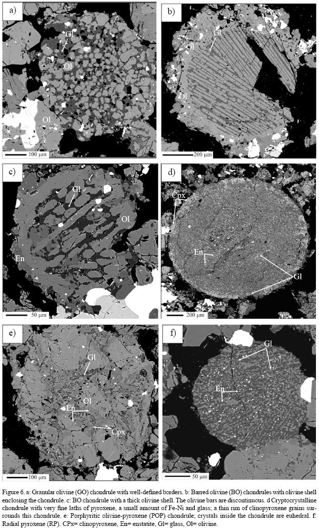Others chondrules were GO (granular olivine) with welldefined borders (Figure 6a); some are porphyritic (with phenocrysts), a common texture termed POP (porphyritic chondrules composed of olivine and pyroxene) (Figure 6e), and finally some are C (cryptocrystalline) (Figure 6d). Apart from these typical petrological textures, other chondrules in Escalón show unusual textures such as probably barred pyroxene with glass (Figure 7a), a transitional texture BO with pyroxene radial texture (Figure 7f), Radial olivine and pyroxene (ROP) chondrules with a complex texture of radial olivine and pyroxene where the fine grained fibers grow in different orientations (Figure 5c). It includes an unusual matrixrich chondrule with chromite and highCa pyroxene (Figure 7b), some glassrich chondrules (Figure 7c, 7e), and one POP chondrule has a large central euhedral olivine crystal with a discontinuous chromite veinlet (possible restitic grain?), which is rimmed by orthopyroxene grains (Figure 7d).