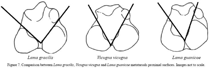 Diagnosis. The size of metapodials is smaller than the Lama guanicoe and slightly larger than the Vicugna vicugna, and the metapodials are comparatively more gracile than in these species. The lower incisors are slightly imbricated; with a thick layer of enamel on the labial face which becomes much thinner towards the lingual face of the tooth layer, especially in the I1. The incisors show bicelated wear facets at their distal extremes. In vicuñas this feature is similar but much developed since the wear facet covers a wider surface at the lingual face of the tooth. On the other hand, in guanacos wear facets are much less developed and over the incisors borders, the dentine is exposed as a fine band on the lingual and labial enamel (Menegaz et al. 1989, p. 160). The wearing down of the inferior incisors is located in the sub quadrangular section, unlike the Vicugna vicugna where this section is enlarged, with a sub rectangular and sub elliptical section.