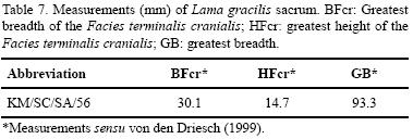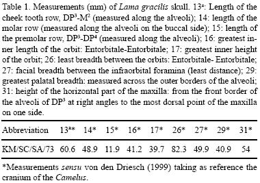 One remarkable trait of the cranium (KM/SC/SA/73) recovered from the Kamac Mayu site, is the great development of the Foramen ethmoidale. Herre (1952) proposes that this feature is evident in guanacos, whereas it is poorly developed or absent in vicuñas. However, this feature cannot be considered as diagnostic, given that it has been observed in some recent camelids (Cartajena, 2003).