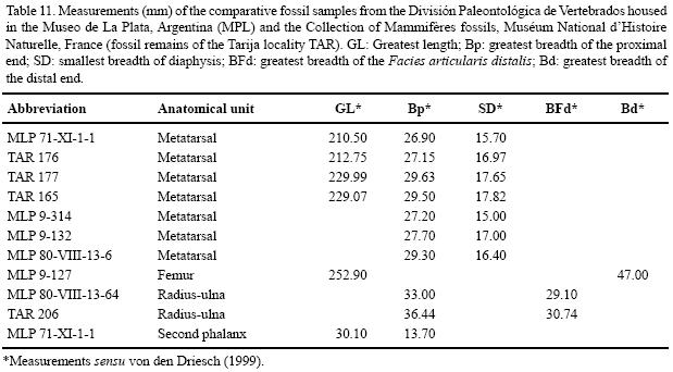 Morphometric analysis was performed in order to study the change and variation of the fossil sample. Size was studied by using osteometric methods and comparing measurements with fossil and modern camelid samples. Measures were taken following criteria presented in von den Driesch (1999) and Menegaz (2000). Multivariate analysis is commonly employed for morphometric studies, specially Principal Components (Menegaz et al., 1989). However, in this case the number of observations is too small for the use of parametric statistics. Instead, we used bivariate scaterplots in order to compare the samples. In addition, a comparative anatomical study focused on the identification and description of diagnostic landmarks or characters was performed. For the morphological description of the material we use the criteria defined by Menegaz (2000), and Scherer et al. (2007) for the dental nomenclature.