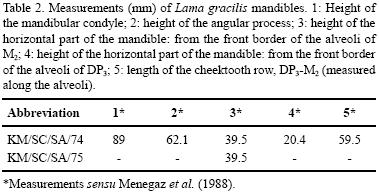 Upper permanent dentition. Various stages of wear can be observed in the four samples studied. In the cranium (KM/SC/SA/73) M1 has also almost totally erupted, whereas the M2 is in the initial stage of eruption (Figure 3a). In the fragment of the maxillary KM/SC/SA/78 a similar situation can be seen, although the M2 is located further into the alveolar cavity. Lastly, in the specimens KM/SC/SA/77 and KM/BB5/C3/SRP the M1 is in the process of eruption, as is the M2, although the latter is more contained. In the M1 the medial lobe is larger than the distal lobe. Like the deciduous premolars, the mesostyle is extended towards the lingual surface, surpassing the parastyle and the metastyle. In the specimen KM/SC/SA/77 both lobes tend to be Vshaped, although this condition is due to the slight wear of this molar as this is not observed in the rest of the material in which Ushaped lobes predominates; this feature is comparable to that observed in a fragment of a left maxillary (MLP. 9. 473) referable to the Lama gracilis from the Vitel Lagoon (Pampean Formation), Argentina. In the M1 of the KM/SC/ SA/77, the trigon fossa is narrow and curved, unlike the talon fossa, which does not show such a sharp convexity. In the same way, the protocone shows a greater labiallingual length than the hypocone. In the rest of the M1 these differences cannot be seen as both the fossas and the cones are very similar. On the other hand, all the M2 studied are in the process of eruption and significant differences between them are not present.