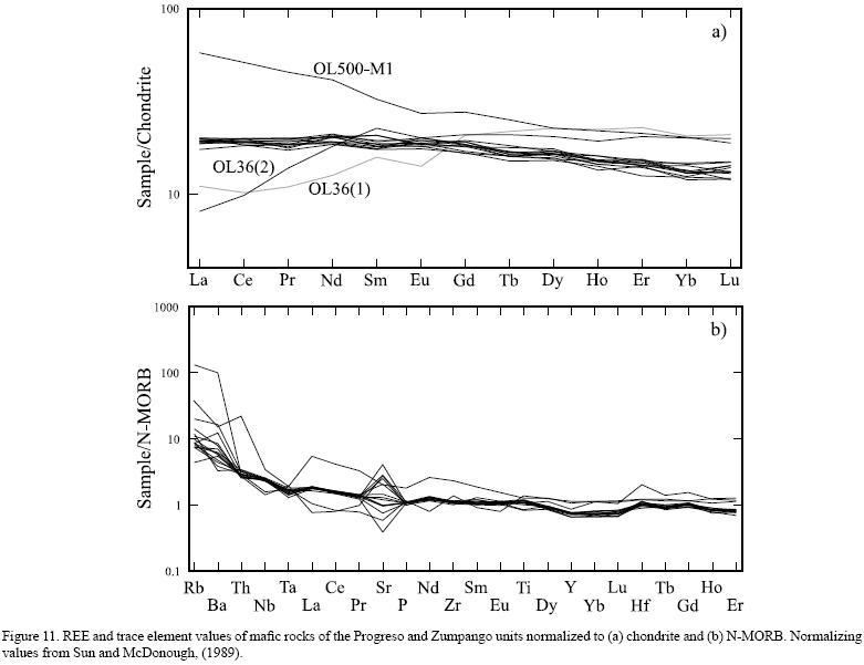 In order to determine the tectonic setting of the Progreso Unit, 15 samples of the pillow basalts from the Naranjo block and one sample of a mafic dike from the Southern block (Figure 2) were analyzed for major and trace elements including rare earth elements (REE) along with four samples of the psammites and pelites. In addition, ten samples of metavolcanic felsic ashes and quartzites from the Zumpango Unit were also analyzed. The data are shown in Table 1.