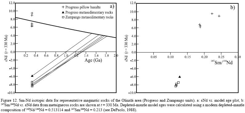 The SmNd isotopic data from six samples of pillow basalts from the Naranjo block, as well as one sample of metasedimentary quartzite from the Progreso Unit and four samples of the Zumpango Unit are shown in Table 2. Details of the analytical procedures for the SmNd isotopic analyses are described by Kerr et al. (1995). La Jolla Nd standard gave an average value of 0.511860. εNd parameters were calculated relative to 143Nd/144Nd = 0.512638 and 147Sm/144Nd = 0.196593 for present day CHUR (Jacobsen and Wasserburg, 1980) and a decay constant 1 147Sm = 6.54 x 1012/year. Nd Model ages [T(DM)] were calculated using the model of DePaolo (1981, 1988). εNd values are calculated for t = 330 Ma, which represents the probable extrusive age of mafic magmatic rocks.