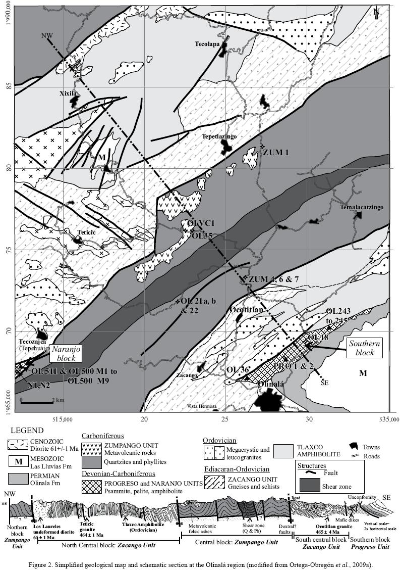The Acatlán complex is tectonically juxtaposed on its eastern, southern and western sides against the ca. 1 Ga Oaxacan and Mesozoic Xolapa complexes, and Cretaceous carbonates, respectively (Figure 1a). To the north, the complex is unconformably overlain by uppermost DevonianLower Permian rocks of the Patlanoya Group (Vachard et al., 2000; Vachard and Floresde Dios, 2002) and by Cenozoic rocks of the TransMexican Volcanic Belt. As the geology (Keppie et al., 2008a and references therein) and detailed mapping supported by geochronology (OrtegaObregón et al., 2009) of the Olinalá area in the western part of the Acatlán complex has been recently published, we present only a summary of the western Acatlán complex geological record here.