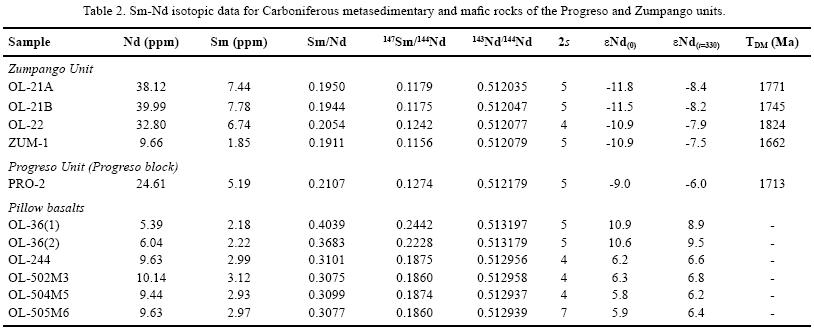 All metasedimentary samples have relatively homogenous SmNd isotopic characteristics, with εNd (t= 330 Ma) of 6 in Progreso quartzite and a range from 7.5 to 8.4 in the Zumpango Unit samples. Ratios of 147Sm/144Nd of all samples range from 0.1156 to 0.1242. Depleted mantle model age (TDM, DePaolo, 1981) of the Progreso Unit quartzite is 1.7 Ga and range from 1.66 to 1.82 Ga in the Zumpango Unit samples (Table 2).