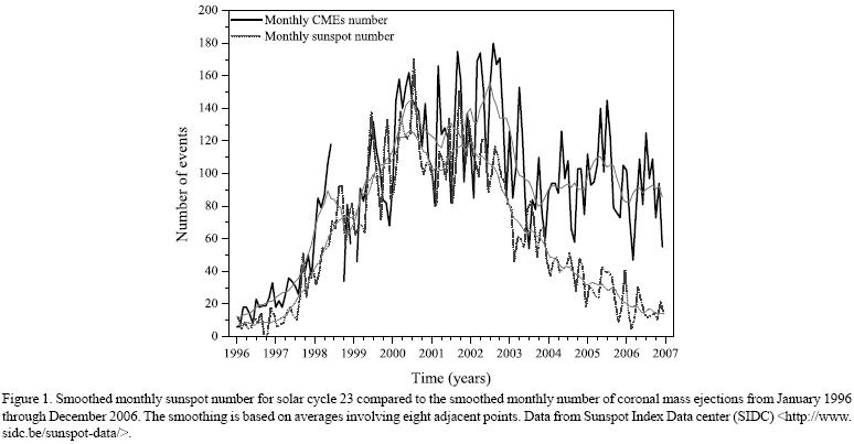 The most representative feature of the solar magnetic cycle is the sunspot cycle. Even though CMEs, as originally defined (Hundhausen et al., 1984; Schwenn 1996), are hydrodynamic phenomena, their origin is spatially and temporally related to active regions (which usually contain sunspots). The temporal behavior of solar cycle 23 as determined from the smoothed monthly relative sunspot number (SIDC, 19962006) is plotted in Figure 1 along with the observed smoothed monthly CME rates. Two major peaks are observed for CMEs, the highest around 2000 and the second between 2002 and 2003. A similar two peaks behavior is observed for sunspot activity but the second peak is located between 2001 and 2002. A larger difference appears after 2003; while sunspots continue decreasing in number, CME rates seem to increase briefly until 2005, when they continue decreasing again, but not reaching the decreasing rate of sunspots. This effect is produced mainly due to different criteria applied in the analysis of the images to obtain the data of the used catalog. A different catalog, CACTus (<www.sidc.be/cactus>), applying other criteria and methods in the image analysis (Robbrecht et al., 2006, Robbrecht 2007, personal communication), shows a behavior similar to the sunspot number on the last decreasing phase.